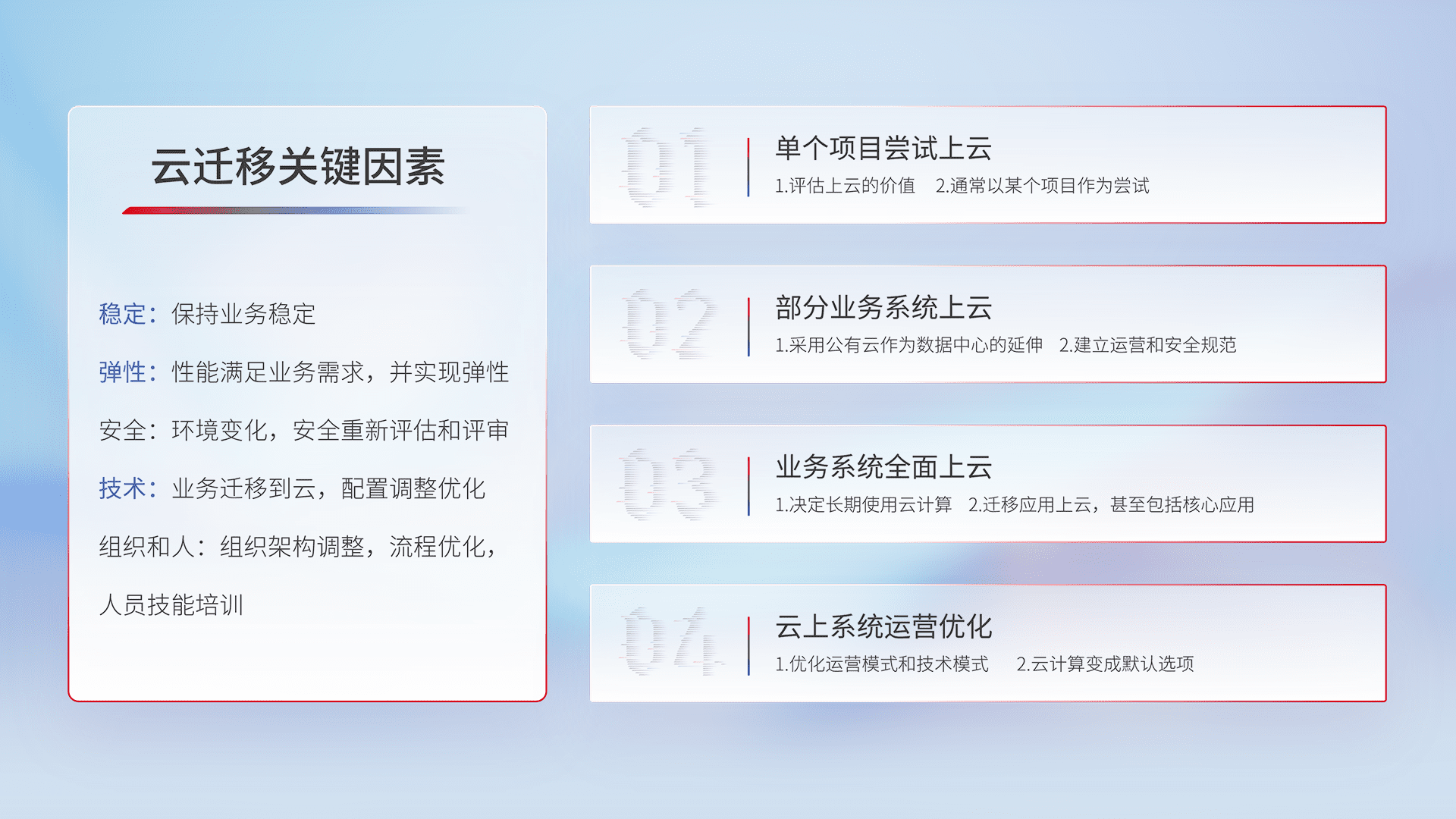 结合实际业务,,从规划设计、、云平台选型、、、、云原生改造、、、、数据迁移、、、、集成交付,,迁移全过程为客户识别最佳上云路径,,,,做好风险识别管理,,设计网络架构、、、、身份权限、、、安全审计合规、、操作审计、、日志审计、、、监控告警策略、、、多站点容灾设计等,,,,对云上基础设施进行整体规划,,提升IT治理水平,,,以满足弹性、、高可用、、、、高性能的需求。。